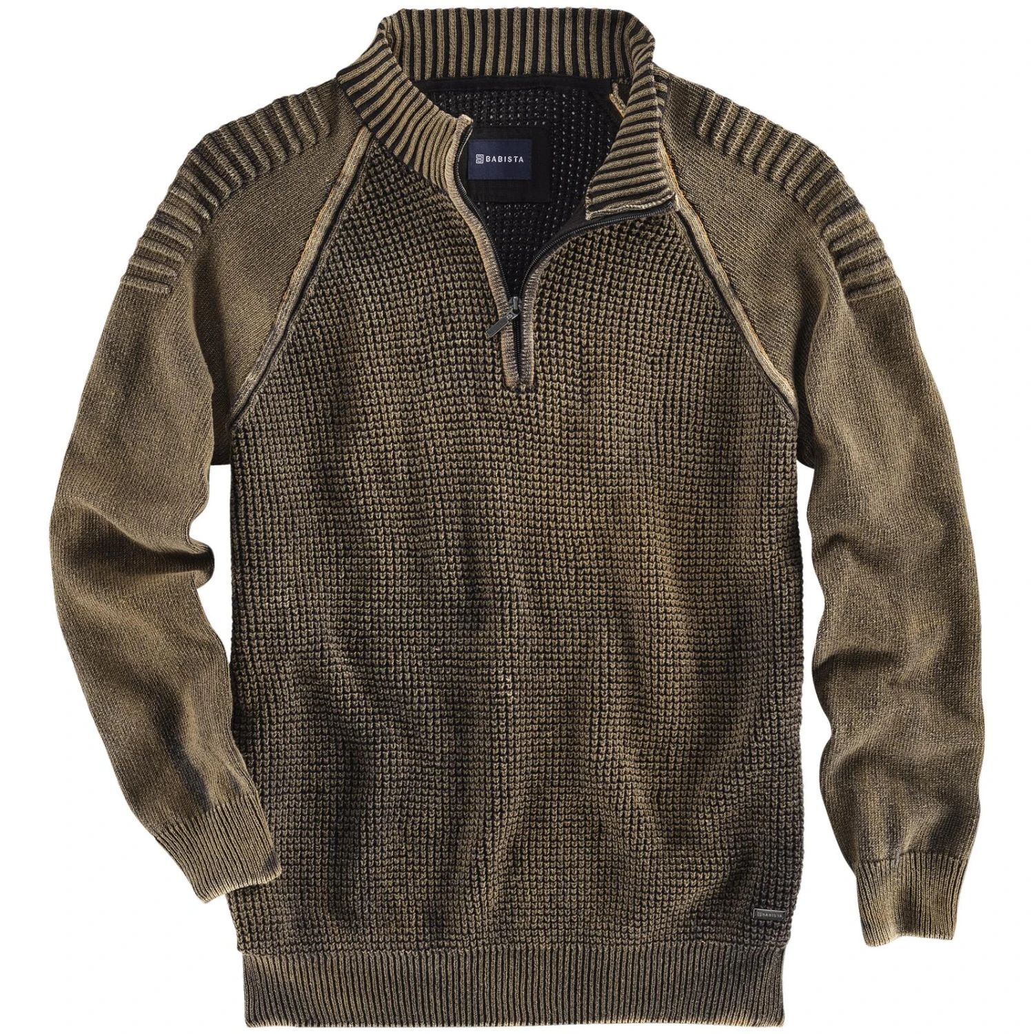 Der modische Pullover TILZIANO zeichnet sich durch eine spezielle Moon-Wash-Technik aus, bekannt durch ihre Verwendung bei Jeans. Diese Methode verleiht dem Pulli einen einzigartigen Vintage-Look, indem sie helle und dunkle Farbschattierungen hervorhebt. In Kombination mit dem Strukturstrick ergibt sich daraus ein unverwechselbares Stück. Zudem macht das Baumwollmaterial es extrem weich und komfortabel. Ein Stehkragen mit verstecktem Reißverschluss rundet das Design ab. Dank elastischer Bündchen an Ärmelenden und Bund hat der Pulli eine tolle Passform. Das BABISTA-Emblem am Bund fügt einen markanten Touch hinzu. Damit ist TILZIANO ideal für kühle Tage.