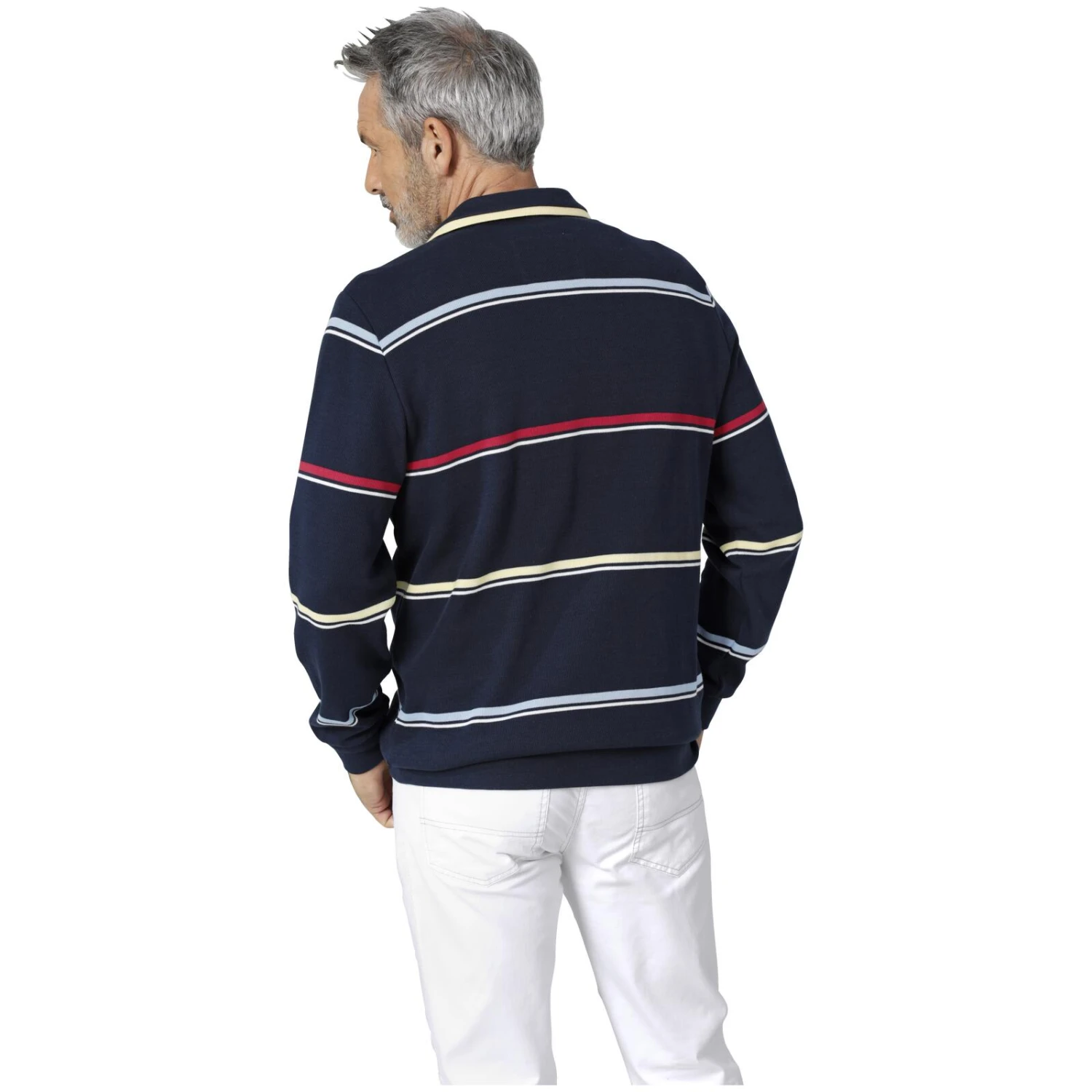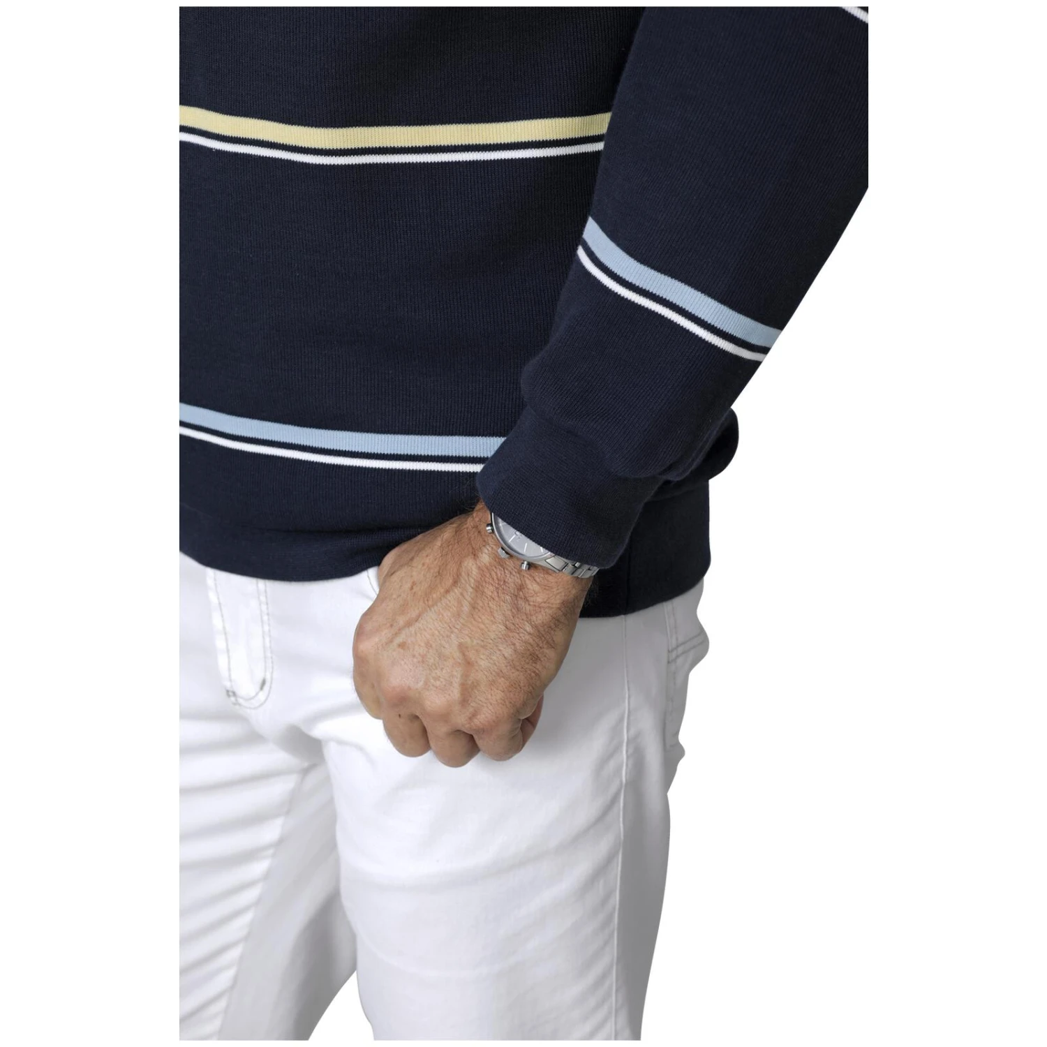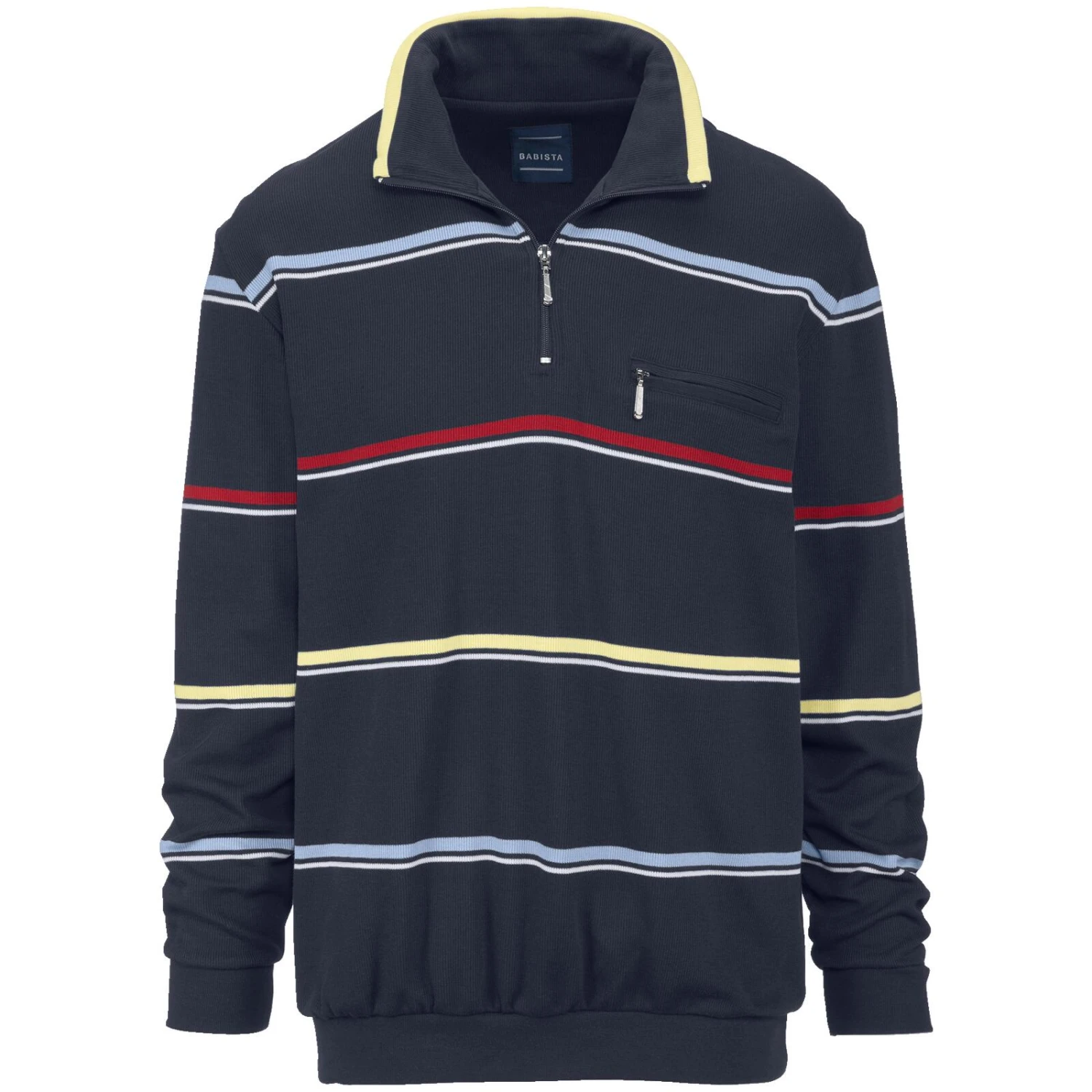 Sweatshirt ROBLI vereint maritimen Charme und sportlichen Stil in einem gestreiften Design auf navyfarbenem Untergrund. Genießen Sie Anpassungsfähigkeit am Hals durch den Troyerkragen und Komfort durch die Premium-Baumwolle. Die Langlebigkeit des Oberteils bleibt durch erstklassige Herstellung, auch nach frequentem Waschen, unverändert. Details: Troyerkragen mit Reißverschluss, Brusttasche mit Reißverschluss und Stickerei sowie doppelt gefertigter elastischer Arm- und Bundabschluss.