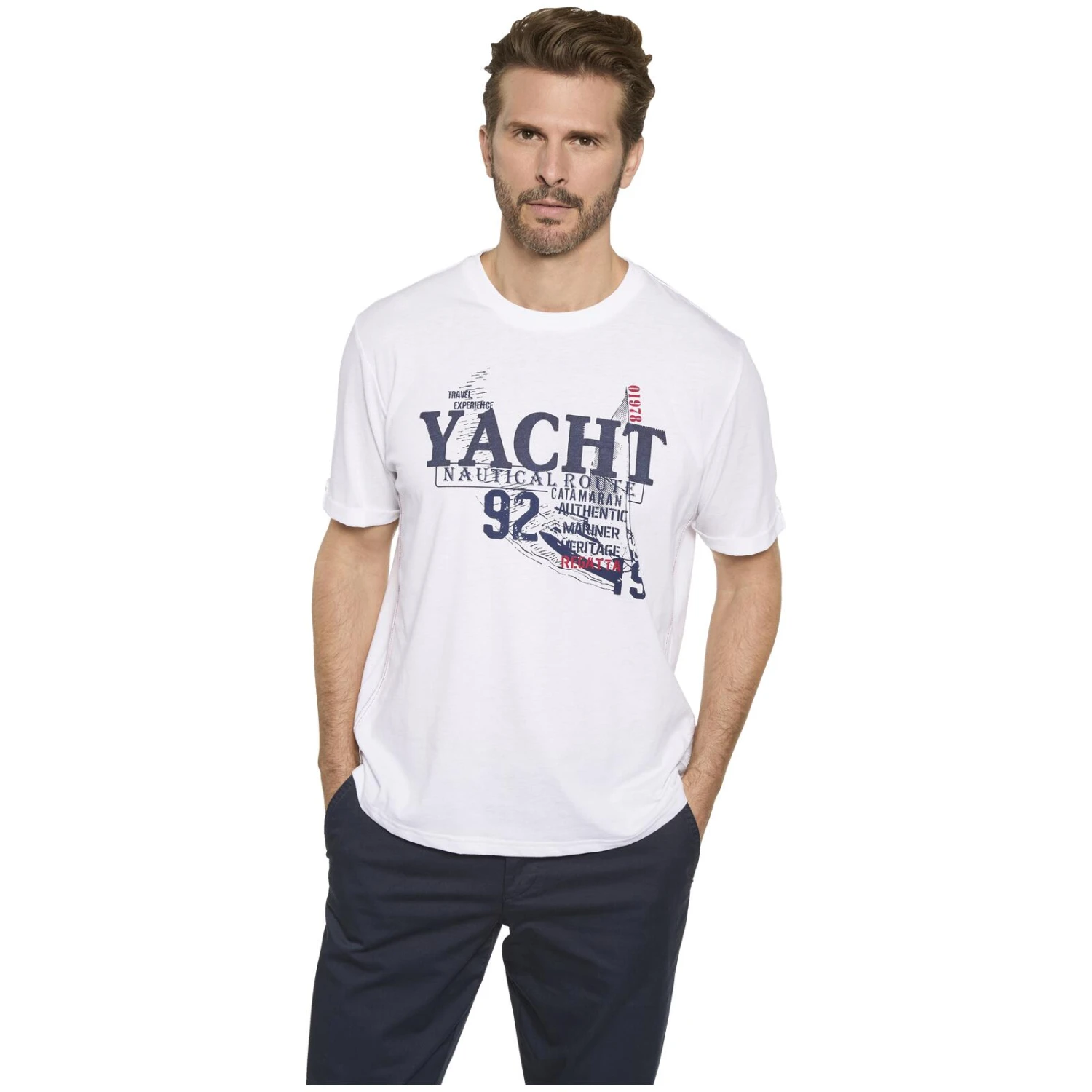 Bereit für eine Ausfahrt auf Ihrer Yacht in T-Shirt MODARI? Das moderne Shirt mit maritimem Print ist wie gemacht dafür, im strahlenden Sonnenschein die Weiten des Meeres zu erkunden. Der klassische Rundhalsausschnitt gibt noch mehr Raum zur Entfaltung des nautischen Looks. Die dezenten Kontrastnähte an den Schultern fügen sich harmonisch ins Gesamtbild ein und verstärken den Eindruck eines perfekten Teils für alle, die den unendlichen Ozean lieben. Also machen Sie sich bereit für entspannte Stunden auf dem Wasser, denn mit T-Shirt MODARI heißt es: Willkommen an Bord!